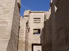 L'archétype du temple égyptien d'époque ramesside est le temple de Khonsou[12] à Karnak. La rigueur de la construction, et notamment de l'agencement, est également omniprésente dans les temples funéraires de cette époque. Lieux de culte divin avant tout, ces monuments suivent les règles, qui semblent alors immuables, de l'architecture du temple de cette époque. Le temple est alors bien souvent accompagné d'un palais, dont le rôle n'est pas encore bien précis[20].