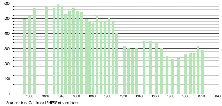 L'évolution du nombre d'habitants est connue à travers les recensements de la population effectués dans la commune depuis 1793. Pour les communes de moins de 10 000 habitants, une enquête de recensement portant sur toute la population est réalisée tous les cinq ans, les populations légales des années intermédiaires étant quant à elles estimées par interpolation ou extrapolation[22]. Pour la commune, le premier recensement exhaustif entrant dans le cadre du nouveau dispositif a été réalisé en 2005[23].