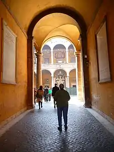 Le plafond a un plafond voûté dans le portique inférieur et un plafond en bois dans le supérieur, tandis que la cour est un impluvium, à la manière de ceux réalisés dans les maisons romaines. Dans l'arche centrale de la loggia inférieure, se trouve une fontaine commandée par le pape Paul V pour orner le palais du Vatican, puis transférée au Palazzo del Commendatore par le pape Alexandre VII.