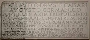 AVGVSTO GERMANICO PONTIFICI MAXIM TRIB POTESTAT XI COS V IMP XXII CENS PATRI PATRIAI SENATVS POPVLVSQVE ROMANVS QVOD REGES BRITANNORVM XI DEVICTOS SINE VLLA IACTVRA IN DEDITIONEM ACCEPERIT GENTESQVE ARBARAS TRANS OCEANVM PRIMVS INDICIONEM POPVLI ROMANI REDEGERIT[7] |