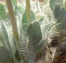 Cette plante de 20 à 50 cm de hauteur est formée d'une touffe de feuilles très velues d'où partent des tiges florales plutôt grêles. Les feuilles de 2,5 à 7,5 cm de long, ont la forme d'un éventail étroit et allongé, et peuvent avoir leur extrémité en pointe ou émoussée. Elles sont d'un bleu-vert rendu grisâtre par de longs poils droits. Les tiges florales sont d'un vert tendre plus franc et sont glabres[1].