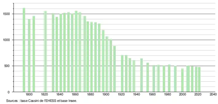 L'évolution du nombre d'habitants est connue à travers les recensements de la population effectués dans la commune depuis 1793. Pour les communes de moins de 10 000 habitants, une enquête de recensement portant sur toute la population est réalisée tous les cinq ans, les populations légales des années intermédiaires étant quant à elles estimées par interpolation ou extrapolation[34]. Pour la commune, le premier recensement exhaustif entrant dans le cadre du nouveau dispositif a été réalisé en 2007[35].