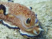 La couleur de fond du manteau est blanc translucide. Un motif réticulé de brun couvre toute la surface sauf la partie externe de la jupe du manteau. Le motif réticulé est très irrégulier, marron, avec un motif dense de taches blanches de taille irrégulière, beaucoup étant légèrement soulevées. À l'extérieur de la région réticulée, une large bande de blanc opaque se confond avec une étroite bande noirâtre au bord du manteau[4]. La base des rhinophores et des branchies est bordée de noir[4],[3]. La tige du rhinophore est d'un blanc opaque et le club est noir, à l'exception d'une pointe blanche translucide. Les branchies sont d'un blanc translucide avec des taches blanches opaques et les bords sont bordés de noir brunâtre foncé. Le pied est également bordé de noir[4].