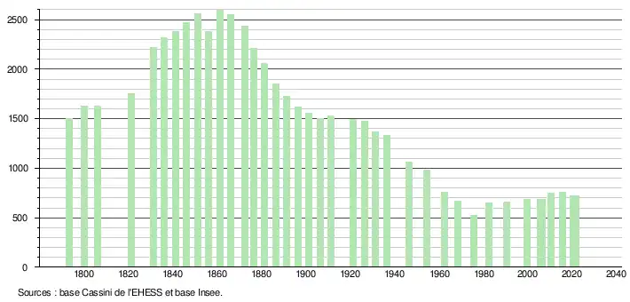 L'évolution du nombre d'habitants est connue à travers les recensements de la population effectués dans la commune depuis 1793. Pour les communes de moins de 10 000 habitants, une enquête de recensement portant sur toute la population est réalisée tous les cinq ans, les populations légales des années intermédiaires étant quant à elles estimées par interpolation ou extrapolation[36]. Pour la commune, le premier recensement exhaustif entrant dans le cadre du nouveau dispositif a été réalisé en 2005[37].