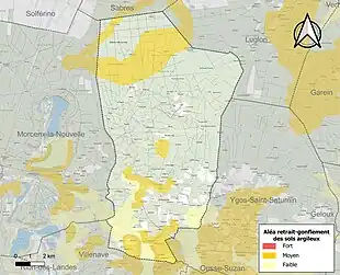 Le retrait-gonflement des sols argileux est susceptible d'engendrer des dommages importants aux bâtiments en cas d’alternance de périodes de sécheresse et de pluie. 20 % de la superficie communale est en aléa moyen ou fort (19,2 % au niveau départemental et 48,5 % au niveau national). Sur les 381 bâtiments dénombrés sur la commune en 2019, 40 sont en aléa moyen ou fort, soit 10 %, à comparer aux 17 % au niveau départemental et 54 % au niveau national. Une cartographie de l'exposition du territoire national au retrait gonflement des sols argileux est disponible sur le site du BRGM[20],[Carte 2].