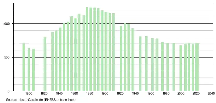 | L'évolution du nombre d'habitants est connue à travers les recensements de la population effectués dans la commune depuis 1793. Pour les communes de moins de 10 000 habitants, une enquête de recensement portant sur toute la population est réalisée tous les cinq ans, les populations légales des années intermédiaires étant quant à elles estimées par interpolation ou extrapolation[24]. Pour la commune, le premier recensement exhaustif entrant dans le cadre du nouveau dispositif a été réalisé en 2005[25]. En 2021, la commune comptait 709 habitants[Note 3], en augmentation de 1,87 % par rapport à 2015 (Landes : +4,9 %, France hors Mayotte : +1,84 %). |