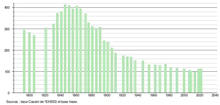 L'évolution du nombre d'habitants est connue à travers les recensements de la population effectués dans la commune depuis 1793. Pour les communes de moins de 10 000 habitants, une enquête de recensement portant sur toute la population est réalisée tous les cinq ans, les populations légales des années intermédiaires étant quant à elles estimées par interpolation ou extrapolation[17]. Pour la commune, le premier recensement exhaustif entrant dans le cadre du nouveau dispositif a été réalisé en 2008[18].