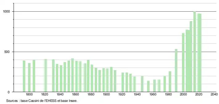 L'évolution du nombre d'habitants est connue à travers les recensements de la population effectués dans la commune depuis 1793. Pour les communes de moins de 10 000 habitants, une enquête de recensement portant sur toute la population est réalisée tous les cinq ans, les populations légales des années intermédiaires étant quant à elles estimées par interpolation ou extrapolation[35]. Pour la commune, le premier recensement exhaustif entrant dans le cadre du nouveau dispositif a été réalisé en 2004[36].