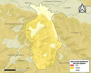 Le retrait-gonflement des sols argileux est susceptible d'engendrer des dommages importants aux bâtiments en cas d’alternance de périodes de sécheresse et de pluie. 75,8 % de la superficie communale est en aléa moyen ou fort (19,2 % au niveau départemental et 48,5 % au niveau national). Sur les 89 bâtiments dénombrés sur la commune en 2019, 55 sont en aléa moyen ou fort, soit 62 %, à comparer aux 17 % au niveau départemental et 54 % au niveau national. Une cartographie de l'exposition du territoire national au retrait gonflement des sols argileux est disponible sur le site du BRGM[20],[Carte 2].