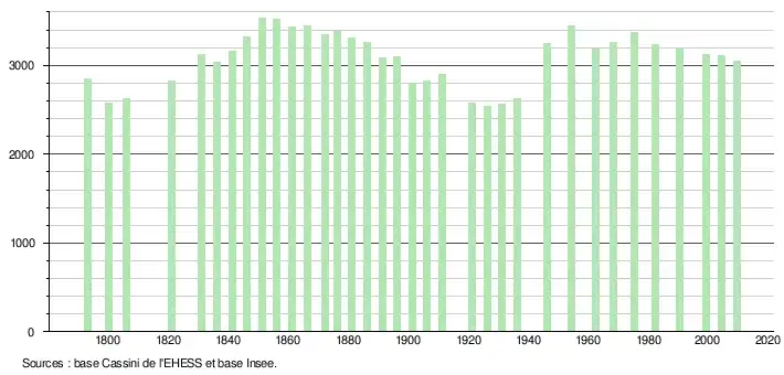 L'évolution du nombre d'habitants est connue à travers les recensements de la population effectués dans la commune depuis 1793. À partir du , les populations légales des communes sont publiées annuellement dans le cadre d'un recensement qui repose désormais sur une collecte d'information annuelle, concernant successivement tous les territoires communaux au cours d'une période de cinq ans. Pour les communes de moins de 10 000 habitants, une enquête de recensement portant sur toute la population est réalisée tous les cinq ans, les populations légales des années intermédiaires étant quant à elles estimées par interpolation ou extrapolation[11]. Pour la commune, le premier recensement exhaustif entrant dans le cadre du nouveau dispositif a été réalisé en 2004[12],[Note 1].