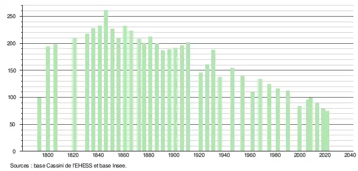 L'évolution du nombre d'habitants est connue à travers les recensements de la population effectués dans la commune depuis 1793. Pour les communes de moins de 10 000 habitants, une enquête de recensement portant sur toute la population est réalisée tous les cinq ans, les populations légales des années intermédiaires étant quant à elles estimées par interpolation ou extrapolation[16]. Pour la commune, le premier recensement exhaustif entrant dans le cadre du nouveau dispositif a été réalisé en 2008[17].