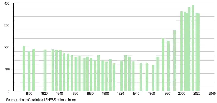 L'évolution du nombre d'habitants est connue à travers les recensements de la population effectués dans la commune depuis 1793. Pour les communes de moins de 10 000 habitants, une enquête de recensement portant sur toute la population est réalisée tous les cinq ans, les populations légales des années intermédiaires étant quant à elles estimées par interpolation ou extrapolation[44]. Pour la commune, le premier recensement exhaustif entrant dans le cadre du nouveau dispositif a été réalisé en 2004[45].