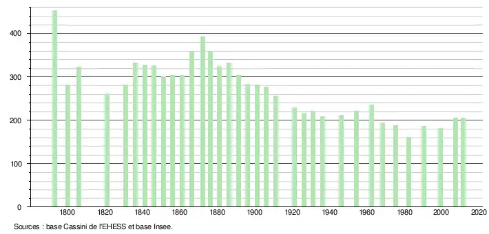 - Dans le tableau des recensements et le graphique, par convention dans Wikipédia, le principe a été retenu, pour les populations légales postérieures à 1999 de n’afficher dans le tableau des recensements et le graphique que les populations correspondant à l'année 2006, première population légale publiée calculée conformément aux concepts définis dans le décret no 2003-485 du 5 juin 2003, et les années correspondant à une enquête exhaustive de recensement pour les communes de moins de 10 000 habitants, ainsi que la dernière population légale publiée par l’Insee.