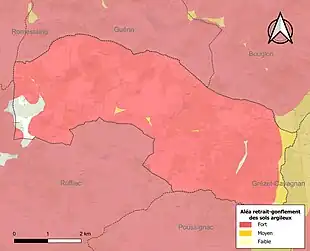 Le retrait-gonflement des sols argileux est susceptible d'engendrer des dommages importants aux bâtiments en cas d’alternance de périodes de sécheresse et de pluie[20]. 97 % de la superficie communale est en aléa moyen ou fort (91,8 % au niveau départemental et 48,5 % au niveau national)[Carte 2]. Depuis le , en application de la loi ELAN, différentes contraintes s'imposent aux vendeurs, maîtres d'ouvrages ou constructeurs de biens situés dans une zone classée en aléa moyen ou fort[Note 3],[21].