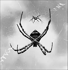 Argiope argentata femelle est remarquable avec la couleur argentée de son céphalothorax et les taches jaunes et noires qui ornent ses pattes et l'extrémité de son abdomen.