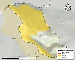 La commune est vulnérable au risque de mouvements de terrains constitué principalement du retrait-gonflement des sols argileux[38]. Cet aléa est susceptible d'engendrer des dommages importants aux bâtiments en cas d’alternance de périodes de sécheresse et de pluie. 58,5 % de la superficie communale est en aléa moyen ou fort (88,8 % au niveau départemental et 48,5 % au niveau national). Sur les 76 bâtiments dénombrés sur la commune en 2019, 3 sont en aléa moyen ou fort, soit 4 %, à comparer aux 98 % au niveau départemental et 54 % au niveau national. Une cartographie de l'exposition du territoire national au retrait gonflement des sols argileux est disponible sur le site du BRGM[39],[Carte 3].