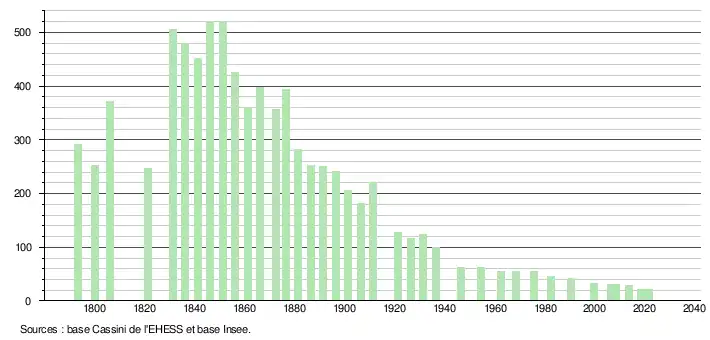 L'évolution du nombre d'habitants est connue à travers les recensements de la population effectués dans la commune depuis 1793. Pour les communes de moins de 10 000 habitants, une enquête de recensement portant sur toute la population est réalisée tous les cinq ans, les populations légales des années intermédiaires étant quant à elles estimées par interpolation ou extrapolation[42]. Pour la commune, le premier recensement exhaustif entrant dans le cadre du nouveau dispositif a été réalisé en 2008[43].