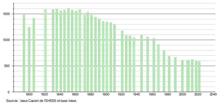 L'évolution du nombre d'habitants est connue à travers les recensements de la population effectués dans la commune depuis 1793. Pour les communes de moins de 10 000 habitants, une enquête de recensement portant sur toute la population est réalisée tous les cinq ans, les populations légales des années intermédiaires étant quant à elles estimées par interpolation ou extrapolation[31]. Pour la commune, le premier recensement exhaustif entrant dans le cadre du nouveau dispositif a été réalisé en 2007[32].