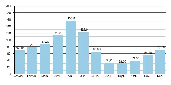 D'autre part les crues peuvent être extrêmement importantes. La série des QIX n'a pas été calculée, mais la série des QJX l'est. Les QJX 2 et QJX 5 valent respectivement 550 et 760 m3/s. Le QJX 10 est de 900 m3/s, le QJX 20 de 1 000 m3/s, tandis que le QJX 50 atteint pas moins de 1 200 m3/s.