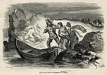 « Le combat fut ainsi rétabli, tous les ennemis prirent la fuite et ne s'arrêtèrent qu'après être parvenus au Rhin, à cinquante mille pas environ du champ de bataille ; quelques-uns, se fiant à leurs forces, essayèrent de le passer à la nage, d'autres se sauvèrent sur des barques. De ce nombre fut Arioviste qui, trouvant une nacelle attachée au rivage, s'échappa ainsi. Tous les autres furent taillés en pièces par notre cavalerie qui s'était mise à leur poursuite. Arioviste avait deux femmes, la première, Suève de nation, qu'il avait amenée avec lui de sa patrie, la seconde, native du Norique, sœur du roi Voccion et qu'il avait épousée dans la Gaule, quand son frère la lui eut envoyée ; toutes deux périrent dans la déroute. De leurs filles, l'une fut tuée et l'autre prise. »— Jules César, Commentaires sur la Guerre des Gaules, Livre I, 53.