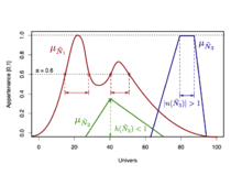 Un sous-ensemble flou [1] sur (représentant par exemple les vitesses dites « élevées ») est défini par sa fonction d'appartenance (ou fonction caractéristique) . Pour une vitesse donnée, v, représente alors le degré d'appartenance de v à .