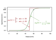 La figure 1 ci-contre illustre la notion de fonction d'appartenance. La courbe verte montre l'évolution du degré d'appartenance : plus la vitesse augmente, plus elle est considérée comme élevée. Cette fonction d'appartenance caractérise donc le sous-ensemble flou des vitesses dite « élevées ». Par opposition, la courbe rouge illustre une fonction d'appartenance qui caractérise un ensemble « classique » équivalent, impliquant un seuil strict (ici, 50 km/h).
