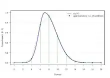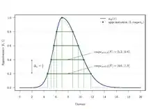 Dans le cas général, la convolution max-min n'a pas de solution analytique, et il est alors nécessaire de se ramener à un espace discret pour pouvoir l'appliquer comme nous l'avons fait sur . L'idée est de réduire la fonction d'appartenance à un nombre limité d'échantillons : plus on conserve d'échantillons, plus l'approximation correspondante est fidèle à la fonction d'appartenance initiale. La figure 7 ci-contre, illustre l'échantillonnage d'un nombre flou.