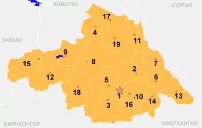 | 19 | Erdenemandal | Эрдэнэмандал сум | 5 933 | 3 400 | 1,74 |