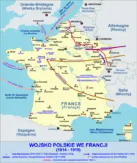 La Première Guerre mondiale fait naître l'espoir chez de nombreux émigrés polonais en France, d'une renaissance de leur pays, alors en partie sous domination de l'Empire russe, allié de la France, et pour les deux autres parties sous domination de l'Empire allemand et de l'Empire austro-hongrois, ennemis de la France. Un grand nombre de ceux-ci s'engagent alors dans l'armée et la Légion étrangère, sans particularisme. Lorsque l'Empire russe s'écroule pendant la révolution de février 1917, la France peut alors former par l'arrêté présidentiel du 4 juin 1917, une armée polonaise en France qui comptera près de 100 000 hommes[1]. Elle reçoit son drapeau national aux Invalides le 15 octobre[2]. Le 1er Régiment de chasseurs polonais est formé en janvier 1918 augmenté de volontaires polonais venus des États-Unis, et de 1 500 prisonniers de guerre allemands d'origine polonaise.