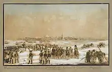 Glückstadt, forteresse danoise à l'embouchure de l'Elbe, résiste encore aux assiégeants commandés par le général prussien Gustav Boye af Gennäs (de) ; une flottille britannique commandée par Arthur Farquhar (en) bombarde la place du côté de la mer. Après une dernière tentative de sortie, la garnison capitule le 5 janvier 1814 : elle obtient la permission de rentrer au Danemark contre la promesse de ne plus combattre pendant un an et un jour ; les vainqueurs saisissent 325 pièces d'artillerie. L'armistice étant expiré le 6 janvier, le corps de Bennigsen entre dans le Schleswig sans combat ; le gouvernement danois fait savoir qu'il est prêt à négocier la paix[35].
