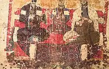 En art durant cette première période, on voit beaucoup de sculptures sur les corniches de bâtiments et parfois des scènes bibliques ou des portraits de mécènes à l’intérieur des bâtiments. Cependant, il faut comprendre que la décoration intérieure ne se fait qu’aux capitales arméniennes[32]. L’art arménien a de particulier qu’il n’y a pas que des personnages bibliques qui sont représentés mais également des personnages historiques et des laïcs[33]. Durant cette même période, on peut voir en peinture des enluminures, des fresques et des mosaïques[34]. De plus, même si Byzance domine l’Arménie à cette période, l’art arménien a des influences perses quant à la façon de représenter l’habillement et la posture des personnages[33].