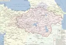 En 387, la situation romaine n'est pas à son meilleur en raison des invasions germaniques. De plus, la Perse connaît l'émergence d'une nouvelle dynastie, les Sassanides. Une certaine influence sur l'Arménie doit être gardée. C'est pourquoi les deux puissances s'entendent sur un partage du royaume[4]. Ainsi, la région devient trois nouvelles entités politiques : la province impériale d'Arménie mineure situé à l'Ouest de l'Euphrate, le royaume de Grande-Arménie situé à l'Est et les satrapies arméniennes au Sud. Les satrapies et le royaume de Grande-Arménie sont sous influence perse et représente les 4/5 du territoire historique arménien. La province impériale est dirigée par un Comes Armeniae, une espèce de gouverneur, jusqu'au règne de Justinien I au VIe siècle[1]. Pendant son règne, Justinien a fait augmenter la taille de la province impériale en intégrant une partie du territoire des satrapies du sud et une partie de la région du Pont en Anatolie[1]. Cette dilatation territoriale a pour conséquence la création de 4 nouvelles entités territoriales, les provinces d'Arménie I à IV[1]. Ces provinces byzantines atteignent leur apogée territorial durant le règne de l'Empereur Maurice qui étend le territoire arménien vers l'Est près de Dvin et au nord-ouest près du lac de Van par le traité de paix de 591.