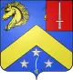 D'azur; au chevron d'or, surmonté de deux têtes de cheval d'or, et en pointe d'un sabre de hussard d'argent à poignée d'or, accompagné de trois étoiles d'argent une et deux; quartier des barons militaires, brochant sur le tout.[4] |