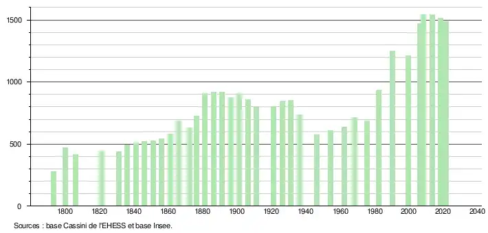 | L'évolution du nombre d'habitants est connue à travers les recensements de la population effectués dans la commune depuis 1793. Pour les communes de moins de 10 000 habitants, une enquête de recensement portant sur toute la population est réalisée tous les cinq ans, les populations légales des années intermédiaires étant quant à elles estimées par interpolation ou extrapolation[35]. Pour la commune, le premier recensement exhaustif entrant dans le cadre du nouveau dispositif a été réalisé en 2008[36]. En 2021, la commune comptait 1 488 habitants[Note 6], en diminution de 2,68 % par rapport à 2015 (Aude : +2,47 %, France hors Mayotte : +1,84 %). |