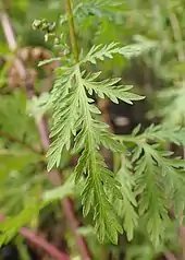Artemisia annua est une plante herbacée à la tige unique dressée en forme de pyramide[4]. En cas d'écrasement, sa souche peut produire une ou deux autres tiges. Très ramifiée et glabre, elle mesure généralement de 50 à 150 cm de haut mais peut atteindre 200 cm. Les feuilles sont alternes, de teinte vert clair tirant sur le jaunâtre. Finement découpé et parsemé de glandes, leur limbe a une forme ovale ou triangulaire ; elles sont bi- à tripennatiséquées et leurs lobes sont linéaires[4],[5],[6].