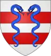 Burelé d'azur et d'argent, à deux serpents de gueules affrontés en pal, leurs queues enroulées. |