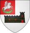 Parti, au 1 de sinople au château d'argent surmonté d'une étoile d'or, au 2 de gueules à la bande d'or engoulée de têtes de dragons du même, lampassées de gueules, accompagnée de deux étoiles aussi d'or, une en chef, une en pointe. |