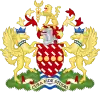 Cimier : un loup d'azur, qui est Lupton family (en) , gorgé d'un collier de roses d'argent, barbelé et épépiné au propre, soutenant à la patte avant dextre un caducée d'or aux serpents de gueules. |