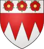 Famille Houtart Émanché en fasce de deux pointes et de deux demies de gueules sur argent, au chef d'argent, chargé de trois roses de gueules, boutonnées d'or, et feuillées de sinople.[69]