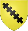 Écartelé, aux 1 et 4 d'or, une croix ancrée de gueules ; aux 2 et 3 d'argent, une hie de sable posée en bande accompagnée de six roses de gueules ordonnées en orle |