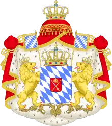 parti de sable au lion d'or contourné armé, couronné et lampassé de gueules (Palatinat du Rhin, contourné) et fuselé en bande d'azur et d'or (Wittelsbach), enté en pointe de gueules à l'orbe crucifère d'or (dignité d'archisénéchal d'Empire)[9]. |