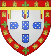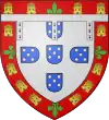 écartelé, au I et IV d'argent, à cinq écussons d'azur, posés en croix, les deux de flanc mis de côté, chaque écusson chargé de cinq besants du champ, posés en sautoir, à la bordure de gueules, chargée de douze châteaux d'or, donjonnés de trois tours, ouverts et ajourés d'azur, aux quatre fleurs de lys de sinople, brisé d'un lambel d'argent, chaque pendant chargé de trois mouchetures d'hermine (qui est d'Aviz-Coimbra), et au II et III d'or à 4 pals de gueules (qui est d'Aragon). |