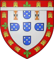 Pierre, dit l'Infant des sept parties (1392-1449), 1er duc de Coimbra, duc de Trévise, deuxième fils de Jean Ier d'argent, à cinq écussons d'azur, posés en croix, les deux de flanc mis de côté, chaque écusson chargé de cinq besants du champ, posés en sautoir, à la bordure de gueules, chargée de douze châteaux d'or, donjonnés de trois tours, ouverts et ajourés d'azur, aux quatre fleurs de lys de sinople, brisé d'un lambel d'argent, chaque pendant chargé de trois mouchetures d'hermine[2]. |
