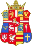 Ecartelé : aux I et IV contre-écartelé d'azur à trois fleurs-de-lys-d'azur, et de gueules aux trois léopards d'or ; au II d'or, au lion de gueules, au double trescheur fleuronné et contre-fleuronné du même ; d'azur, à la harpe d'or, cordée d'argent ; sur le tout d'or, à neuf cœurs de gueules, posés en trois pals, à trois lions léopardés d'azur, armés et lampassés de gueules, couronnés du champ, brochant sur-le-tout (de Danemark) ; un label d'argent brochant sur la partition, le deuxième lambel chargé d'une Croix de saint Georges de gueules |