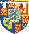 Ecartelé, en I et IV de gueules aux trois léopards d'or, en II d'or, au lion de gueules, au double trescheur fleuronné et contre-fleuronné du même et en III d'azur, à la harpe d'or, cordée d'argent, un lambel d'argent brochant sur la partition ; sur le tout, écartelé d'or et de gueules, à quatre lions de l'un à l'autre armés et lampassés d'azur, et surmonté de la couronne de Prince de Galles |