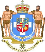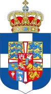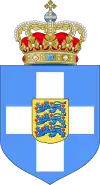 D'azur, à la croix alésée d'argent (de Grèce), sur-le-tout d'or, à neuf cœurs de gueules, posés en trois pals, à trois lions léopardés d'azur, armés et lampassés de gueules, couronnés du champ, brochant sur-le-tout (de Danemark)
