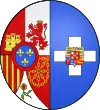 Parti en I, écartelé au 1 de gueules au château d'or couvert et ajouré d'azur (de Castille), au 2 d'argent au lion de gueules armé, lampassé et couronné d'or (de León), au 3 d'or aux quatre pals de gueules, qui est de Aragon, au 4 de gueules aux chaînes d'or posées en orle, en croix et en sautoir, chargées en cœur d'une émeraude au naturel (de Navarre), accompagné en pointe d'argent à une pomme grenade de gueules tigé et feuillé de sinople (de Grenade) et sur le tout d'azur aux trois fleurs de lys d'or à la bourdure de gueules (d'Anjou) et en II, D'azur, à la croix alésée d'argent (de Grèce), sur-le-tout écartelé : à la croix pattée d'argent bordée de gueules, qui est le Danebrog, cantonnée en I, d'or, à neuf cœurs de gueules, posés en trois pals, à trois lions léopardés d'azur, armés et lampassés de gueules, couronnés du champ, brochant sur-le-tout (de Danemark) ; en II, d'or, à deux lions léopardés d'azur, armés et lampassés de gueules (de Schleswig) ; en III, coupé : À d'azur, à trois couronnes d'or (de Suède moderne) et B coupé de gueules à une peau de morue d'argent tenue en pal par une traverse de sable, le tout couronné d'or et coupé d'azur à un bélier d'argent passant lampassé de gueules et armé d'or et d'azur à un ours polaire d'argent armé du premier ; en IV, coupé d'or au lion léopardé d'azur soutenu de neuf cœurs de gueules ordonnés 5 et 4 (du Royaume des Goths) et de gueules au dragon d'or (du Royaume des Vandales) ; sur-le-tout écartelé au 1 de gueules, à la feuille d'ortie d'argent (de Holstein) au 2 de gueules, au cygne d'argent, becqué, membré et colleté d'une couronne d'or (Stormarn), au 3 de gueules, au cavalier armé d'argent (Dithmarse), au 4 de gueules à la tête de cheval coupée d'or (de Lauenbourg) ; sur-le-tout-du-tout parti d'or à deux fasces de gueules (de Oldenbourg) et d'azur, à la croix pattée, au pied fiché d'or (de Delmenhorst). |
