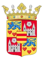 Ecartelé, en I et IV de gueules aux trois léopards d'or, en II d'or, au lion de gueules, au double trescheur fleuronné et contre-fleuronné du même et en III d'azur, à la harpe d'or, cordée d'argent, un lambel à cinq pendants d'argent brochant sur la partition, les premier, troisième et cinquième pendants chargé d'une abeille d'or |