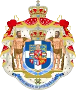Au pairle patté d'or, cantonné en chef d'azur, à trois couronnes d'or (de Suède moderne), à dextre de gueules, au lion couronné d'or, tenant dans ses pattes une hallebarde d'argent, emmanchée du second et à sénestre d'azur, à trois barres ondées d'argent, au lion couronné d'or, brochant sur le tout (de Suède ancien), sur-le-tout écartelé : 1, de gueules, à la feuille d'ortie d'argent (de Holstein) ; 2, d'or, à deux lions léopardés d'azur, armés et lampassés de gueules (de Schleswig) ; 3, de gueules, au cygne d'argent, becqué, membré et colleté d'une couronne d'or (de Stormarn) ; 4, de gueules, au cavalier armé d'argent (de Dithmarse) ; sur-le-tout-du-tout, écartelé d'or à deux fasces de gueules (de Oldenbourg) et d'azur, à la croix pattée, au pied fiché d'or (de Delmenhorst).. |