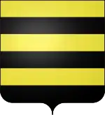 (fr) Écartelé, au premier et au quatrième de gueules au lion à la queue fourchée d'argent armé et lampassé d’or, couronné et colleté du même, au deuxième et au troisième fascé d'or et de sable